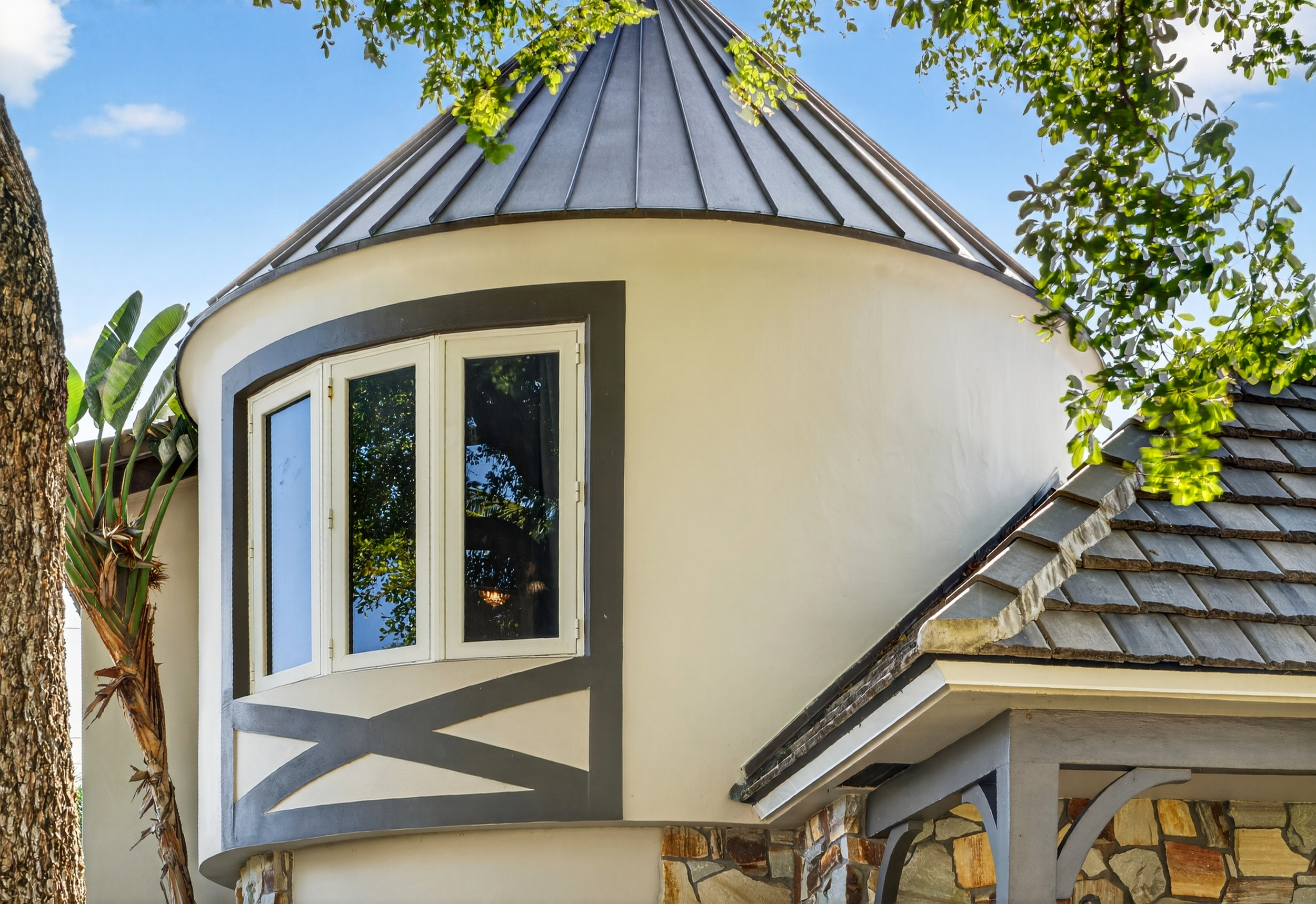 Signature rounded copper turret with rounded Dining room and bedroom.