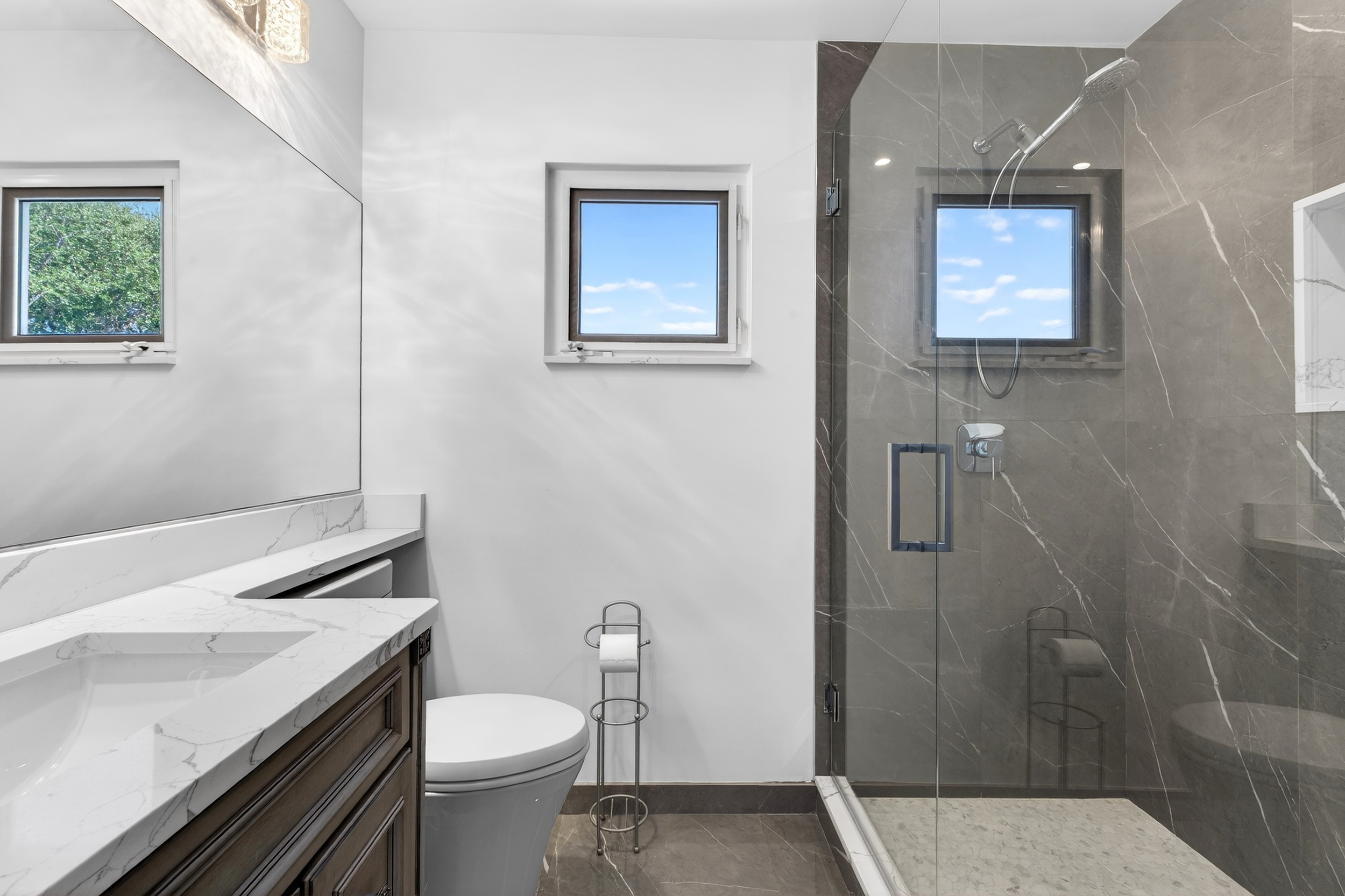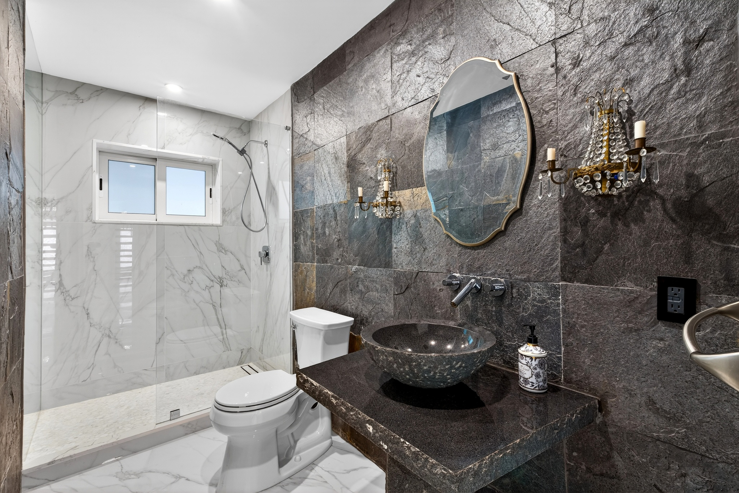 Inside, rich materials and thoughtful design create a warm, and inviting atmosphere. Travertine, marble, and porcelain tile flow throughout, while a signature copper turret with its round-shaped rooms, a limestone fireplace, and a sculptural hand-forged floating staircase give this home its unique character. The chef’s kitchen pairs modern function with Scandinavian style, high-gloss cabinetry, premium Bosch and Dacor appliances, and crystal-pattern marble countertops.